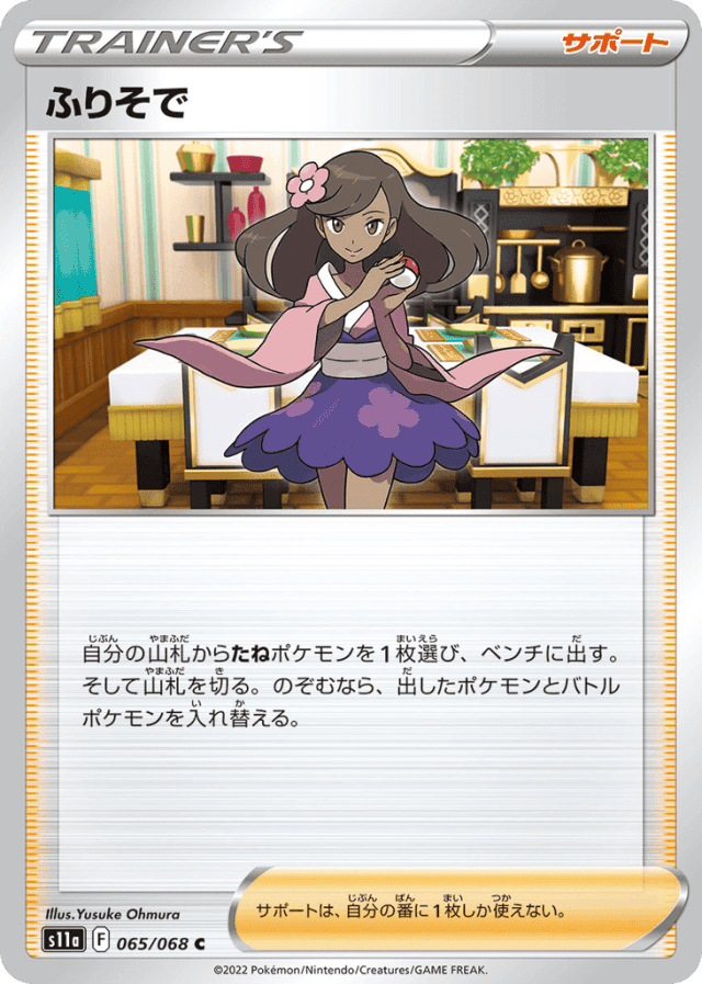 自分の山札からたねポケモンを1枚選び、ベンチに出す。そして山札を切る。のぞむなら、出したポケモンとバトルポケモンを入れ替える。 サポートは、自分の番に1枚しか使えない。