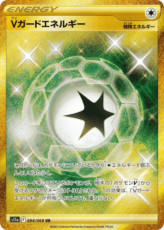 このカードは、ポケモンについているかぎり、Colorlessエネルギー1個ぶんとしてはたらく。 このカードをつけているポケモンが、相手の「ポケモンV」から受けるワザのダメージは「-30」される。この効果は、「Vガードエネルギー」が何枚ついていても、重ならない。