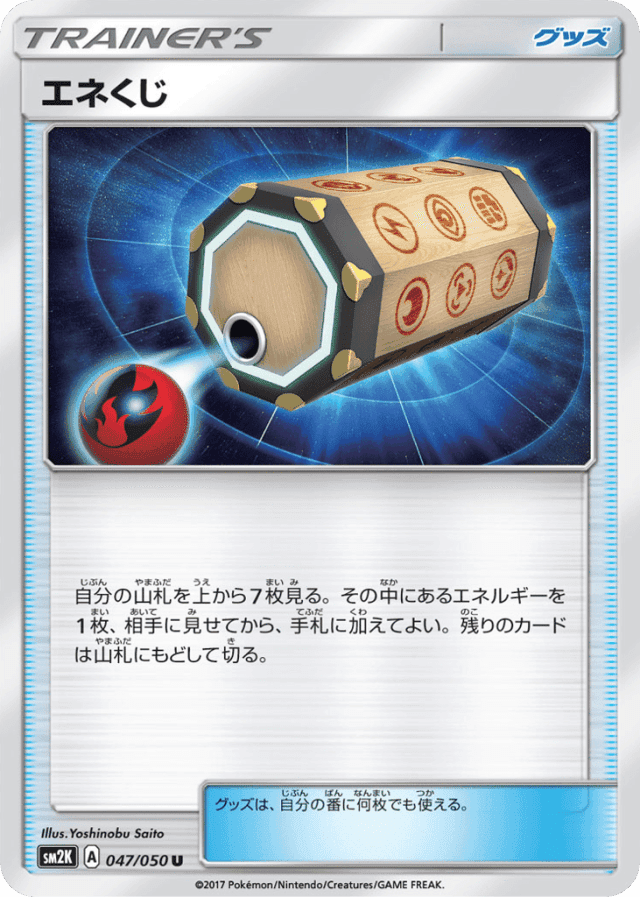 自分の山札を上から7枚見る。その中にあるエネルギーを1枚、相手に見せてから、手札に加えてよい。残りのカードは山札にもどして切る。 グッズは、自分の番に何枚でも使える。