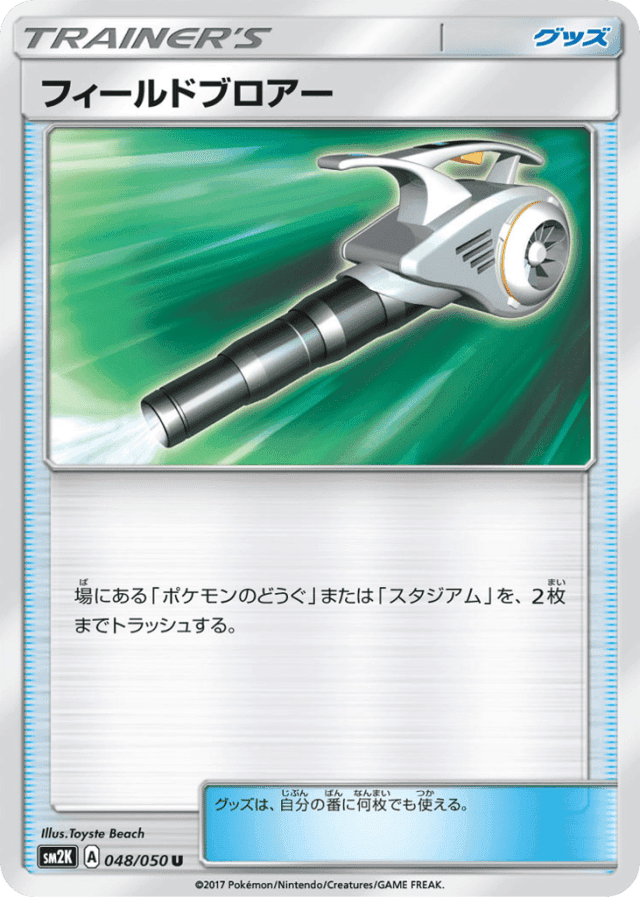 場にある「ポケモンのどうぐ」または「スタジアム」を、2枚までトラッシュする。 グッズは、自分の番に何枚でも使える。