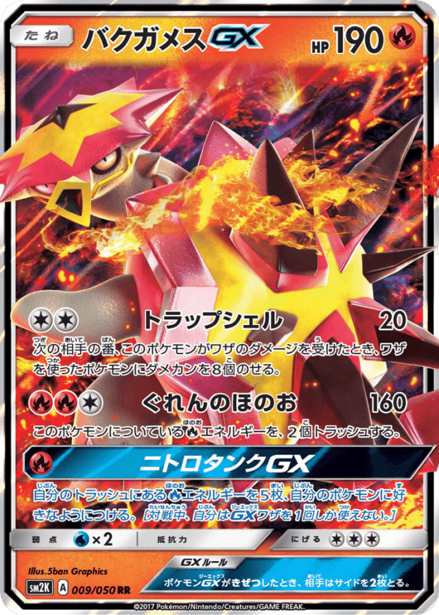 Nitro Tank-GXCost: 1自分のトラッシュにあるFireエネルギーを5枚、自分のポケモンに好きなようにつける。[対戦中、自分はGXワザを1回しか使えない。]
