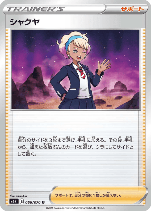 自分のサイドを3枚まで選び、手札に加える。その後、手札から、加えた枚数ぶんのカードを選び、ウラにしてサイドとして置く。 サポートは、自分の番に1枚しか使えない。