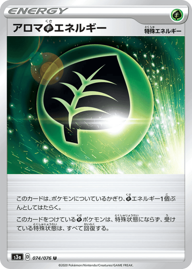 このカードは、ポケモンについているかぎり、Grassエネルギー1個ぶんとしてはたらく。 このカードをつけているGrassポケモンは、特殊状態にならず、受けている特殊状態は、すべて回復する。