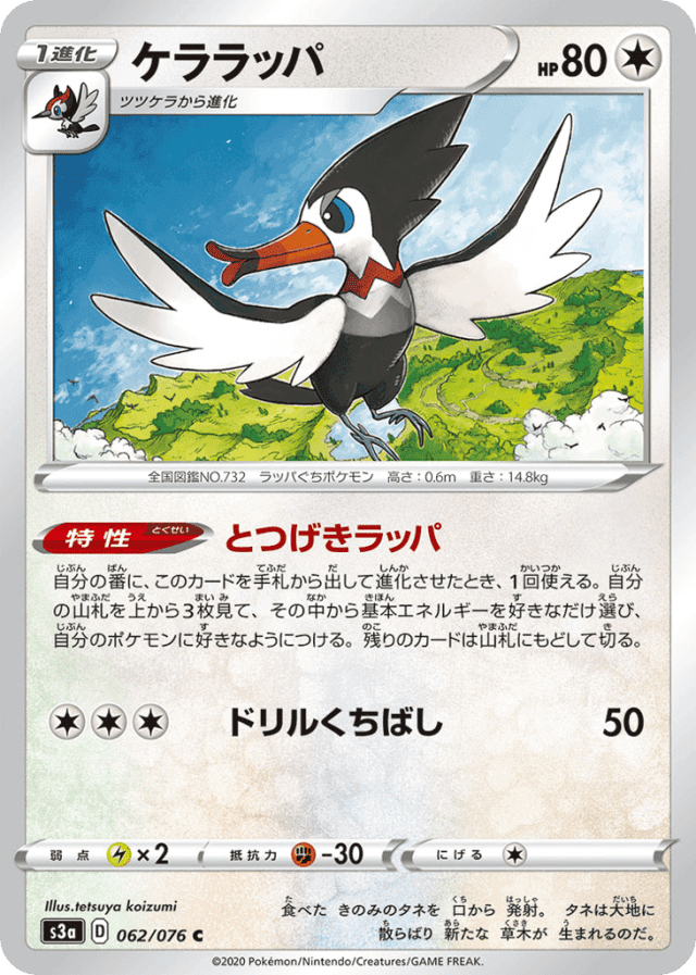 Charging Trumpet自分の番に、このカードを手札から出して進化させたとき、1回使える。自分の山札を上から3枚見て、その中から基本エネルギーを好きなだけ選び、自分のポケモンに好きなようにつける。残りのカードは山札にもどして切る。