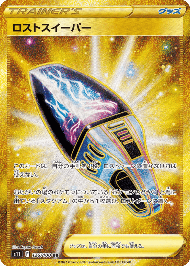 - このカードは、自分の手札を1枚、ロストゾーンに置かなければ使えない。 — おたがいの場のポケモンについている「ポケモンのどうぐ」と場に出ている「スタジアム」の中から1枚選び、ロストゾーンに置く。 — グッズは、自分の番に何枚でも使える。