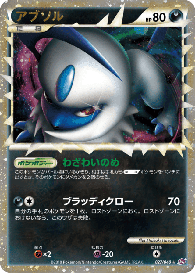 As long as Absol is your Active Pokémon, whenever your opponent puts a Basic Pokémon from his or her hand onto his or her Bench, put 2 damage counters on that Pokémon.