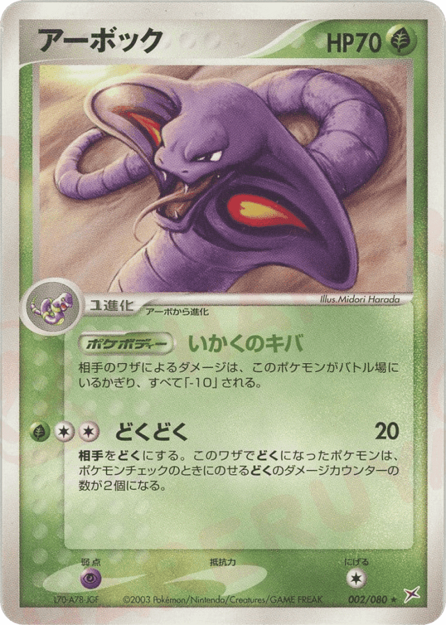 As long as Arbok is your Active Pokémon, any damage done to your Pokémon by an opponent's attack is reduced by 10 (before applying Weakness and Resistance).