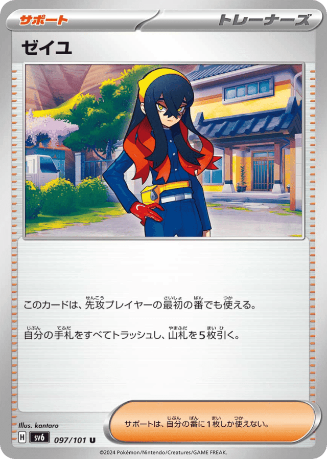このカードは、先攻プレイヤーの最初の番でも使える。 自分の手札をすべてトラッシュし、山札を5枚引く。 サポートは、自分の番に1枚しか使えない。