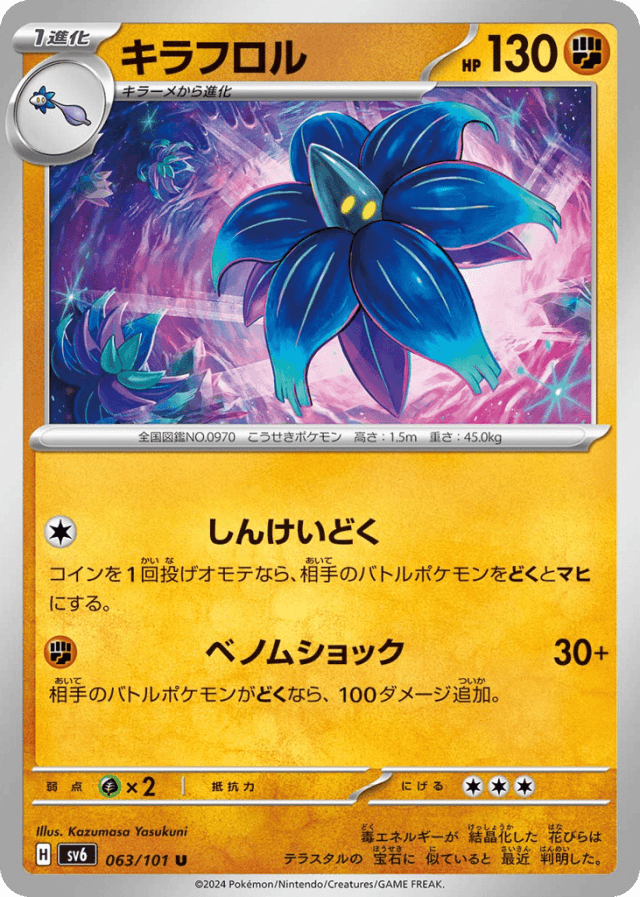 Stun PoisonCost: 1コインを1回投げオモテなら、相手のバトルポケモンをどくとマヒにする。