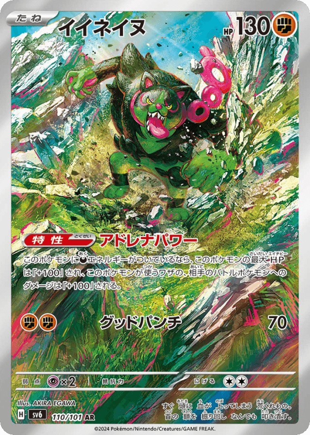 Adrenaline PowerこのポケモンにDarknessエネルギーがついているなら、このポケモンの最大HPは「+100」され、このポケモンが使うワザの、相手のバトルポケモンへのダメージは「+100」される。