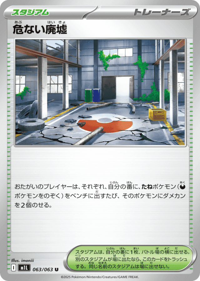 おたがいのプレイヤーは、それぞれ、自分の番に、たねポケモン(Darknessポケモンをのぞく)をベンチに出すたび、そのポケモンにダメカンを2個のせる。 スタジアムは、自分の番に1枚だけ、バトル場の横に出せる。別の名前のスタジアムが場に出たなら、このカードをトラッシュする。