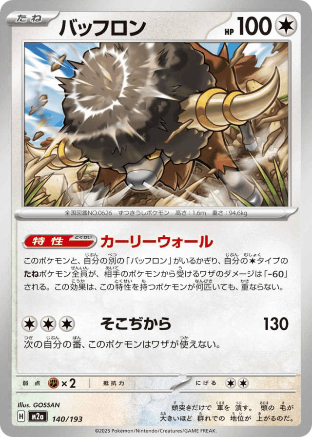 このポケモンと、自分の別の「バッフロン」がいるかぎり、自分のColorlessタイプのたねポケモン全員が、相手のポケモンから受けるワザのダメージは「-60」される。この効果は、この特性を持つポケモンが何匹いても、重ならない。