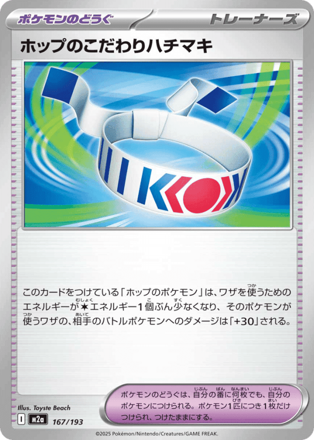 このカードをつけている「ホップのポケモン」は、ワザを使うためのエネルギーがColorlessエネルギー1個ぶん少なくなり、そのポケモンが使うワザの、相手のバトルポケモンへのダメージは「+30」される。