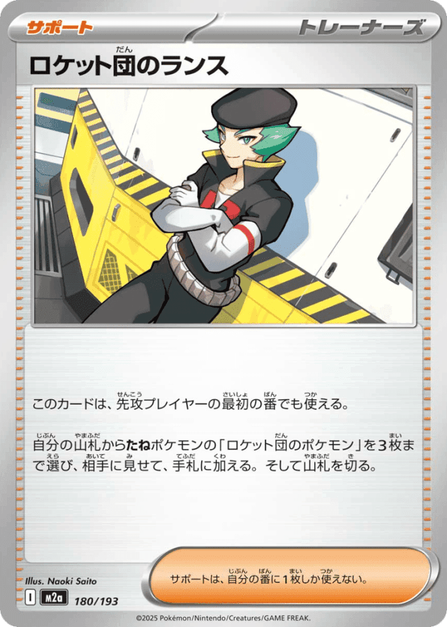 このカードは、先攻プレイヤーの最初の番でも使える。 自分の山札からたねポケモンの「ロケット団のポケモン」を3枚まで選び、相手に見せて、手札に加える。そして山札を切る。 サポートは、自分の番に1枚しか使えない。