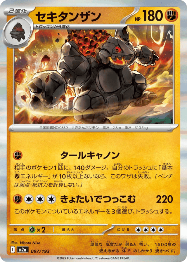 Tar CannonCost: 1相手のポケモン1匹に、140ダメージ。自分のトラッシュに「基本Fightingエネルギー」が10枚以上ないなら、このワザは失敗。[ベンチは弱点・抵抗力を計算しない。]