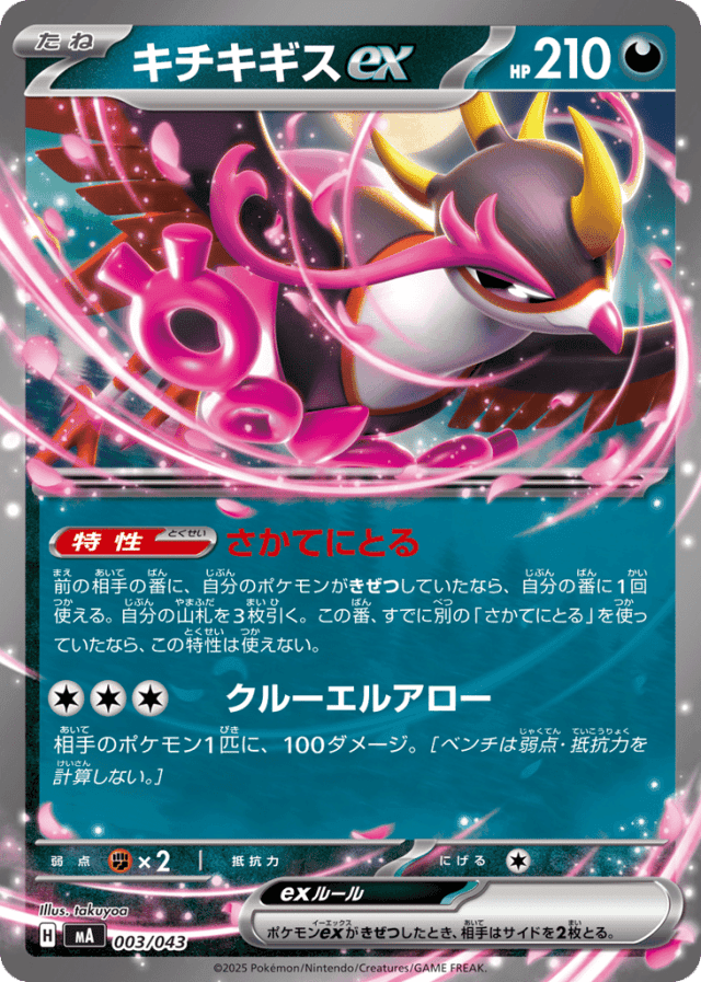 前の相手の番に、自分のポケモンがきぜつしていたなら、自分の番に1回使える。自分の山札を3枚引く。この番、すでに別の「さかてにとる」を使っていたなら、この特性は使えない。