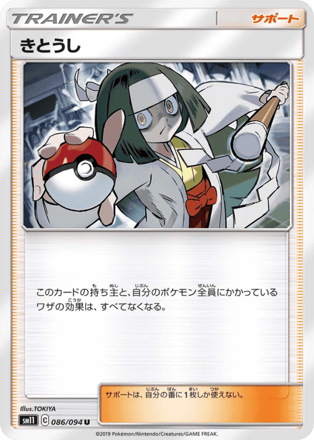 このカードの持ち主と、自分のポケモン全員にかかっているワザの効果は、すべてなくなる。 サポートは、自分の番に1枚しか使えない。