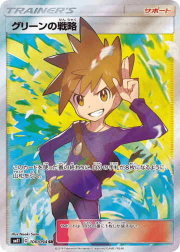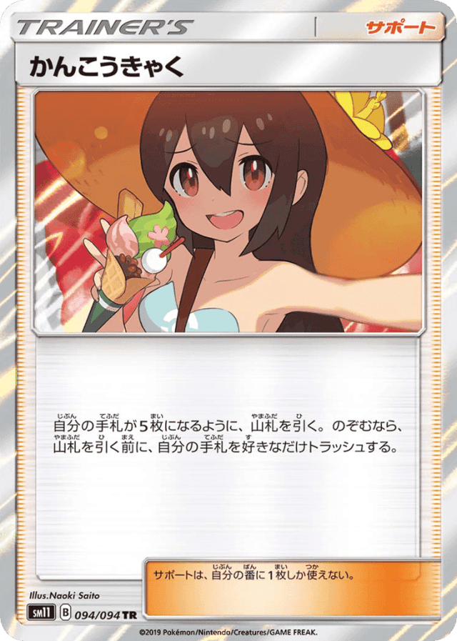 自分の手札が5枚になるように、山札を引く。のぞむなら、山札を引く前に、自分の手札を好きなだけトラッシュする。 サポートは、自分の番に1枚しか使えない。