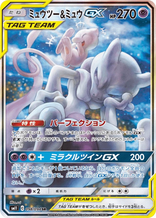 Perfectionこのポケモンは、自分のベンチまたはトラッシュにある「ポケモンGX・EX」が持っているワザを、すべて使える。[ワザを使うためのエネルギーは必要。]