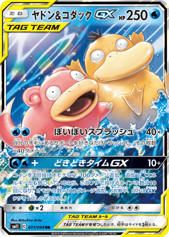 コインを1回投げオモテなら、100ダメージ追加。追加でWaterエネルギーが6個ついているなら、このワザで投げるコインの数は10回になり、オモテの数×100ダメージ追加。[対戦中、自分はGXワザを1回しか使えない。]