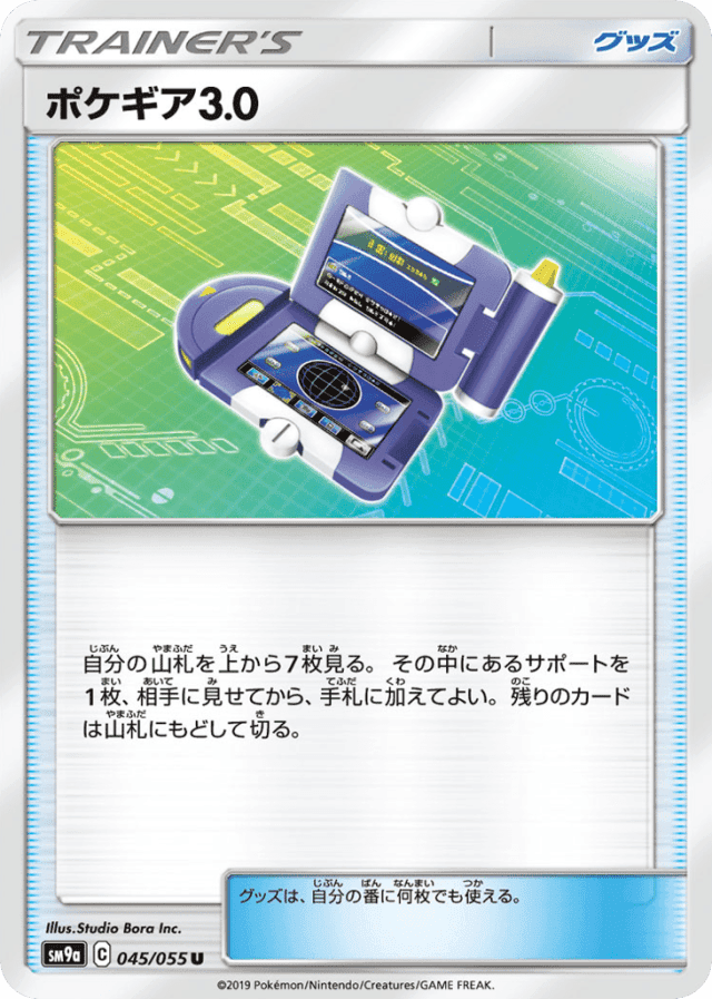 自分の山札を上から7枚見る。その中にあるサポートを1枚、相手に見せてから、手札に加えてよい。残りのカードは山札にもどして切る。 グッズは、自分の番に何枚でも使える。
