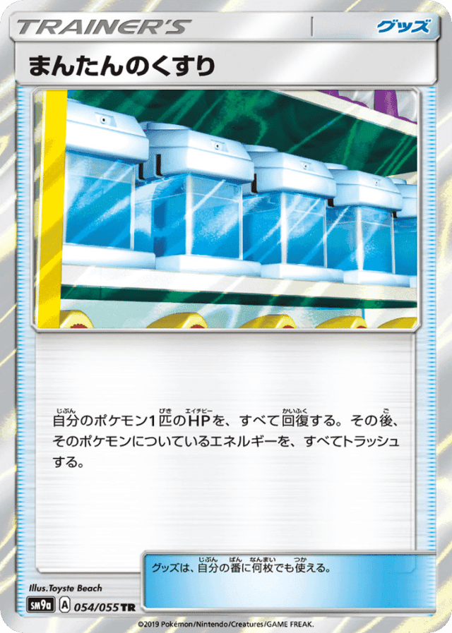 自分のポケモン1匹のHPを、すべて回復する。その後、そのポケモンについているエネルギーを、すべてトラッシュする。 グッズは、自分の番に何枚でも使える。