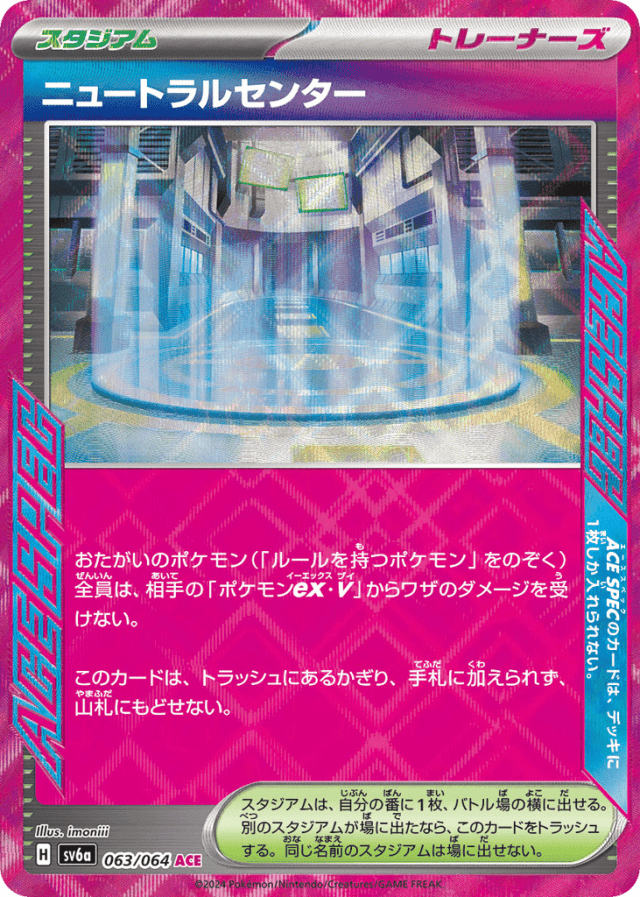 おたがいのポケモン(「ルールを持つポケモン」をのぞく)全員は、相手の「ポケモンex・V」からワザのダメージを受けない。 このカードは、トラッシュにあるかぎり、手札に加えられず、山札にもどせない。 スタジアムは、自分の番に1枚だけ、バトル場の横に出せる。別の名前のスタジアムが場に出たなら、このカードをトラッシュする。