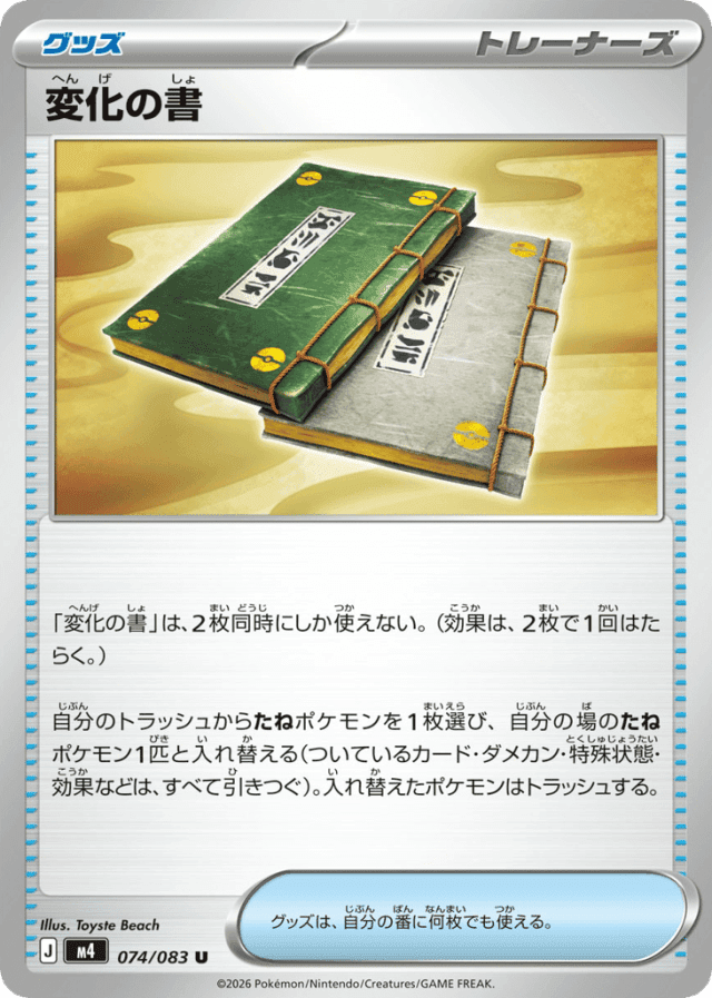 「変化の書」は、2枚同時にしか使えない。(効果は、2枚で1回はたらく。) 自分のトラッシュからたねポケモンを1枚選び、自分の場のたねポケモン1匹と入れ替える(ついているカード・ダメカン・特殊状態・効果などは、すべて引きつぐ)。入れ替えたポケモンはトラッシュする。 グッズは、自分の番に何枚でも使える。