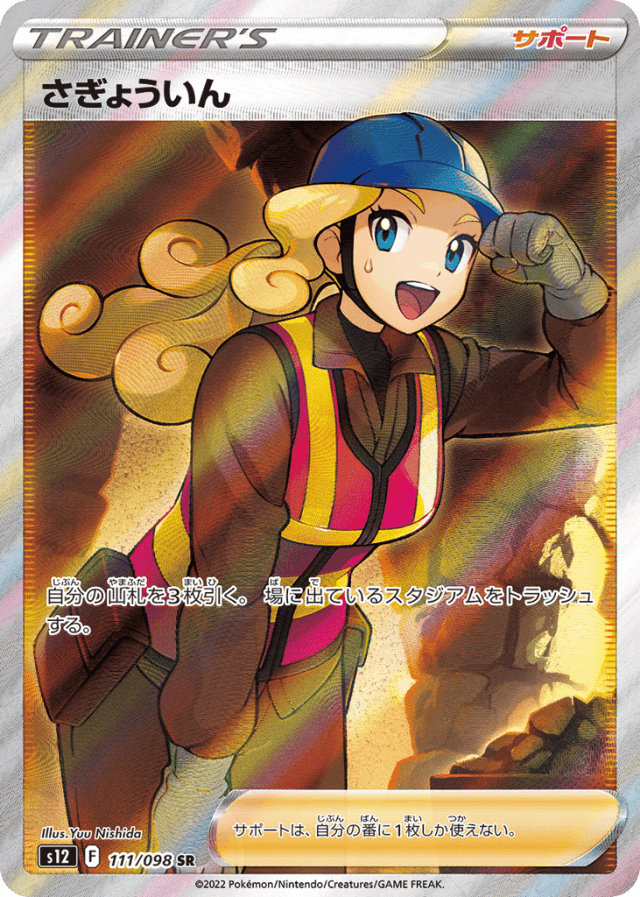 自分の山札を3枚引く。場に出ているスタジアムをトラッシュする。 サポートは、自分の番に1枚しか使えない。