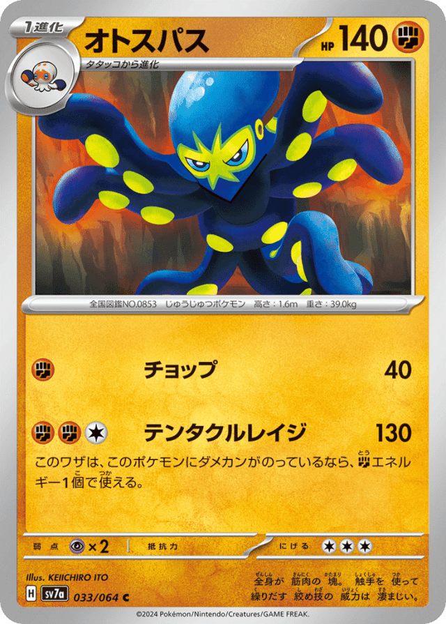 Tentacle Rage130Cost: 3このワザは、このポケモンにダメカンがのっているなら、Fightingエネルギー1個で使える。