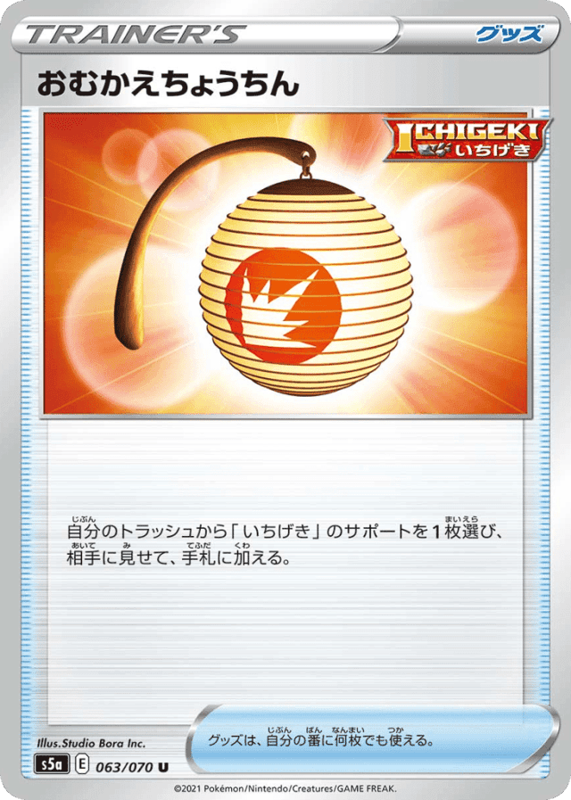 自分のトラッシュから「いちげき」のサポートを1枚選び、相手に見せて、手札に加える。 グッズは、自分の番に何枚でも使える。