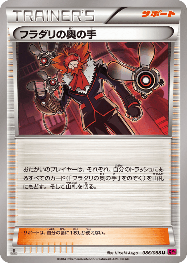 おたがいのプレイヤーは、それぞれ、自分のトラッシュにあるすべてのカード(「フラダリの奥の手」をのぞく)を山札にもどす。そして山札を切る。 サポートは、自分の番に1枚しか使えない。