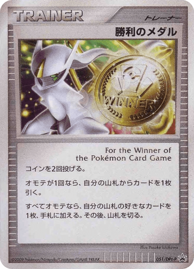 コインを2回投げる。<br> オモテが1回なら、自分の山札からカードを1枚引く。<br> すべてオモテなら、自分の山札の好きなカードを1枚、手札に加える。その後、山札を切る。 グッズは、自分の番に何枚でも使える。