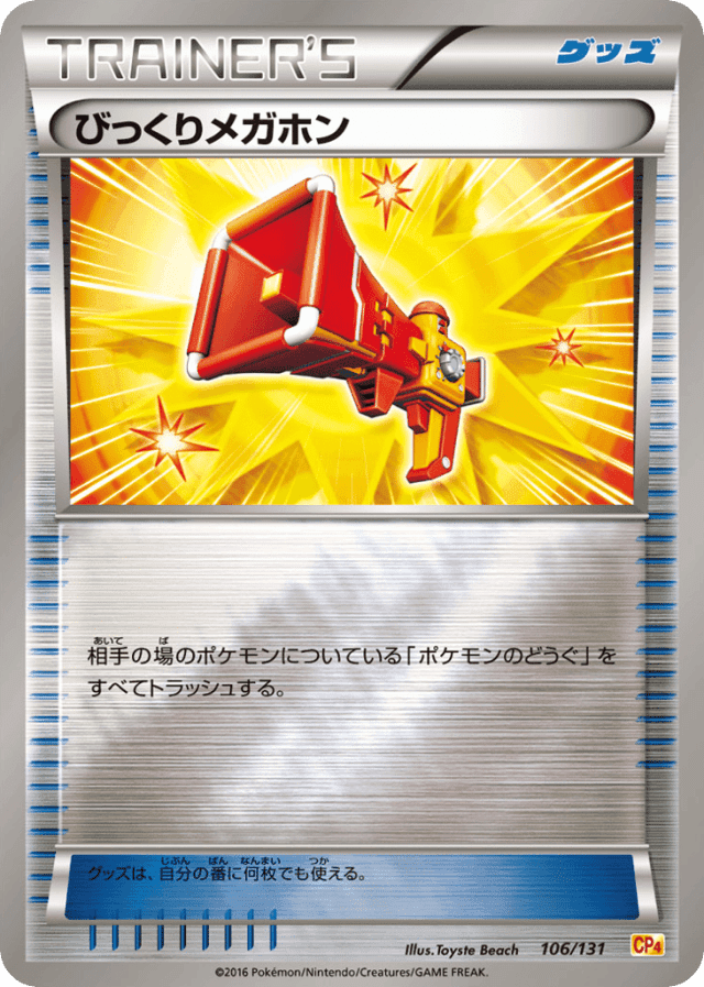 相手の場のポケモンについている「ポケモンのどうぐ」をすべてトラッシュする。 グッズは、自分の番に何枚でも使える。