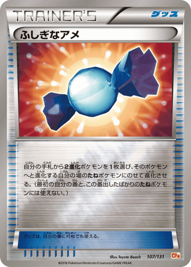自分の手札から2進化ポケモンを1枚選び、そのポケモンへと進化する自分の場のたねポケモンにのせて進化させる。(最初の自分の番と、この番出したばかりのたねポケモンには使えない。) グッズは、自分の番に何枚でも使える。