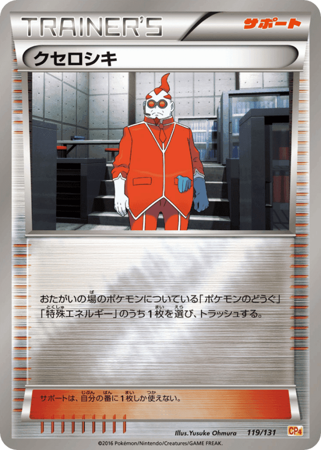 おたがいの場のポケモンについている「ポケモンのどうぐ」「特殊エネルギー」のうち1枚を選び、トラッシュする。 サポートは、自分の番に1枚しか使えない。