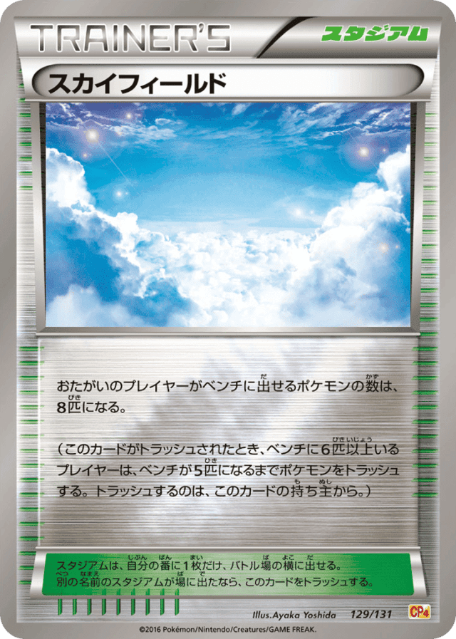おたがいのプレイヤーがベンチに出せるポケモンの数は、8匹になる。 (このカードがトラッシュされたとき、ベンチに6匹以上いるプレイヤーは、ベンチが5匹になるまでポケモンをトラッシュする。トラッシュするのは、このカードの持ち主から。) スタジアムは、自分の番に1枚だけ、バトル場の横に出せる。別の名前のスタジアムが場に出たなら、このカードをトラッシュする。