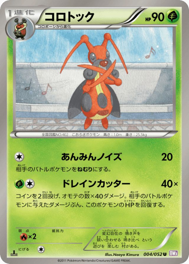 Draining Cut40×Cost: 2コインを2回投げ、オモテの数×40ダメージ。相手のバトルポケモンに与えたダメージぶん、このポケモンのHPを回復する。