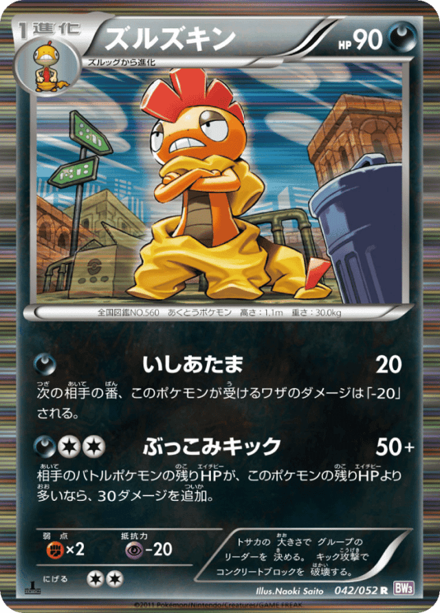 Hammer Kick50+Cost: 3相手のバトルポケモンの残りHPが、このポケモンの残りHPより多いなら、30ダメージを追加。
