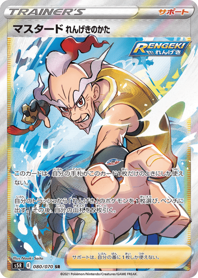 このカードは、自分の手札がこのカード1枚だけのときにしか使えない。 自分のトラッシュから「れんげき」のポケモンを1枚選び、ベンチに出す。その後、自分の山札を5枚引く。 サポートは、自分の番に1枚しか使えない。