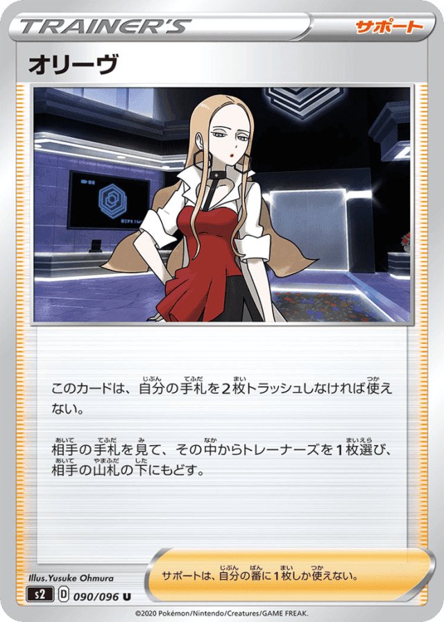 このカードは、自分の手札を2枚トラッシュしなければ使えない。 相手の手札を見て、その中からトレーナーズを1枚選び、相手の山札の下にもどす。 サポートは、自分の番に1枚しか使えない。
