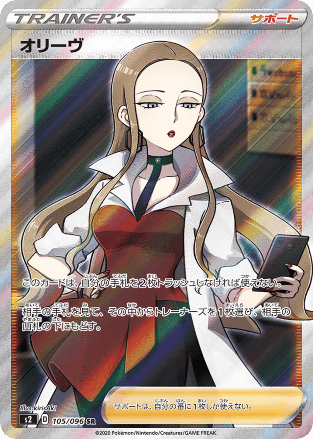 このカードは、自分の手札を2枚トラッシュしなければ使えない。 相手の手札を見て、その中からトレーナーズを1枚選び、相手の山札の下にもどす。 サポートは、自分の番に1枚しか使えない。