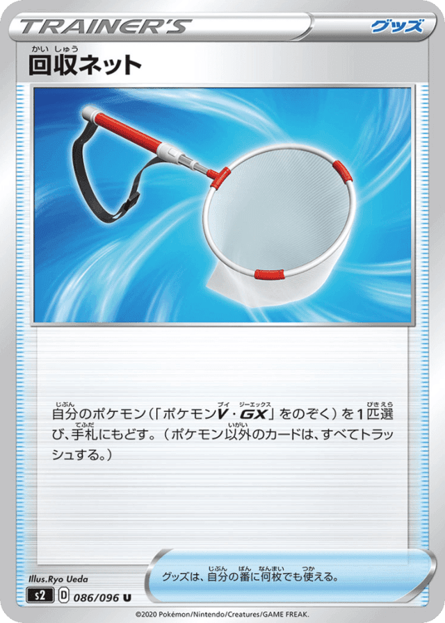自分のポケモン(「ポケモンV・GX」をのぞく)を1匹選び、手札にもどす。(ポケモン以外のカードは、すべてトラッシュする。) グッズは、自分の番に何枚でも使える。