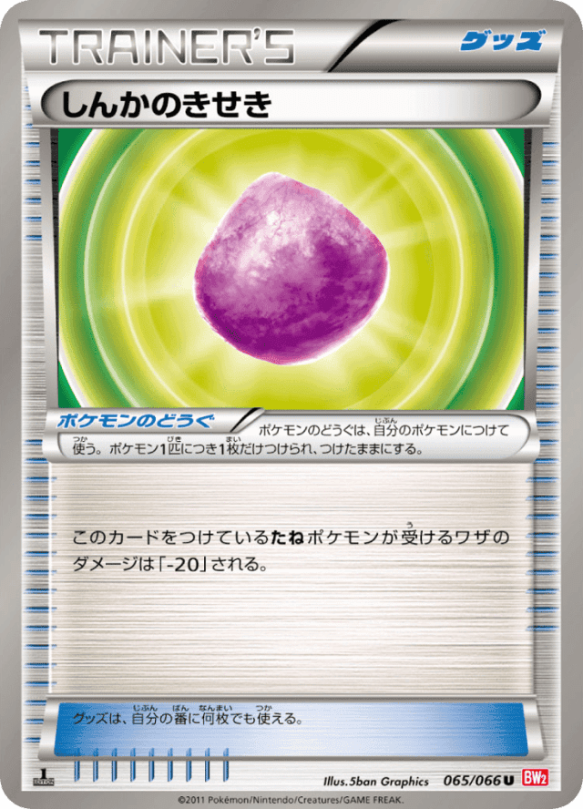 - このカードをつけているたねポケモンが受けるワザのダメージは「-20」される。