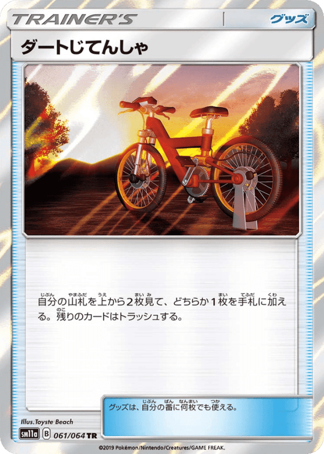 自分の山札を上から2枚見て、どちらか1枚を手札に加える。残りのカードはトラッシュする。 グッズは、自分の番に何枚でも使える。