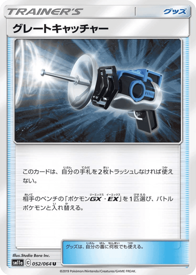 - このカードは、自分の手札を2枚トラッシュしなければ使えない。 — 相手のベンチの「ポケモンGX・EX」を1匹選び、バトルポケモンと入れ替える。 — グッズは、自分の番に何枚でも使える。