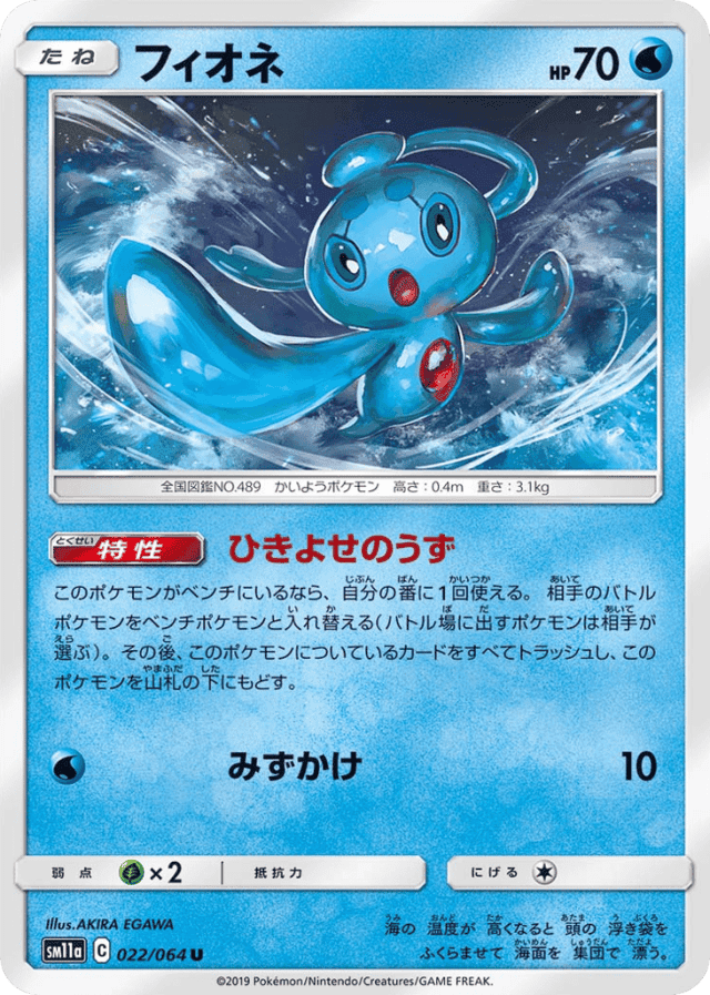 Whirlpool Suctionこのポケモンがベンチにいるなら、自分の番に1回使える。相手のバトルポケモンをベンチポケモンと入れ替える(バトル場に出すポケモンは相手が選ぶ)。その後、このポケモンについているカードをすべてトラッシュし、このポケモンを山札の下にもどす。