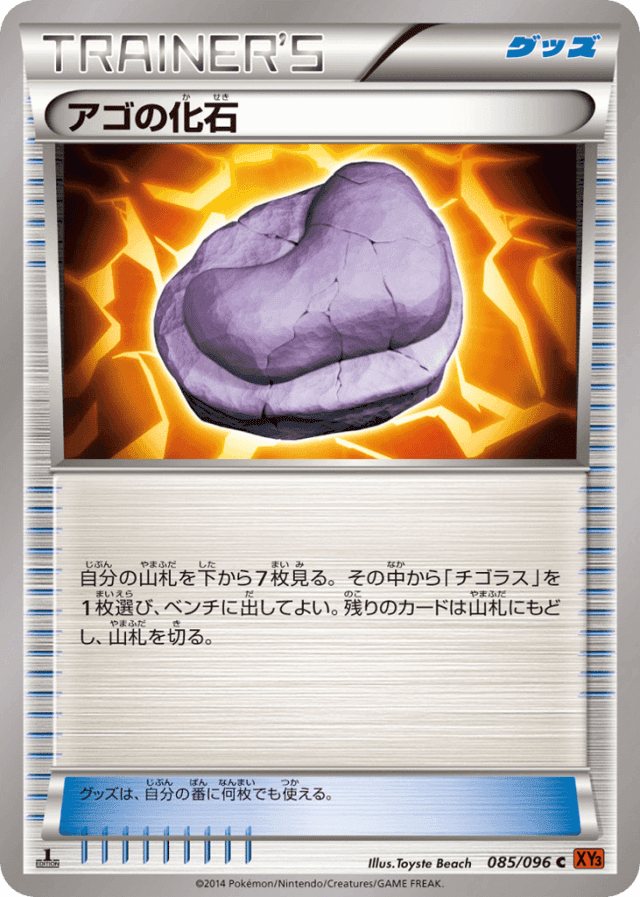 自分の山札を下から7枚見る。その中から「チゴラス」を1枚選び、ベンチに出してよい。残りのカードは山札にもどし、山札を切る。 グッズは、自分の番に何枚でも使える。