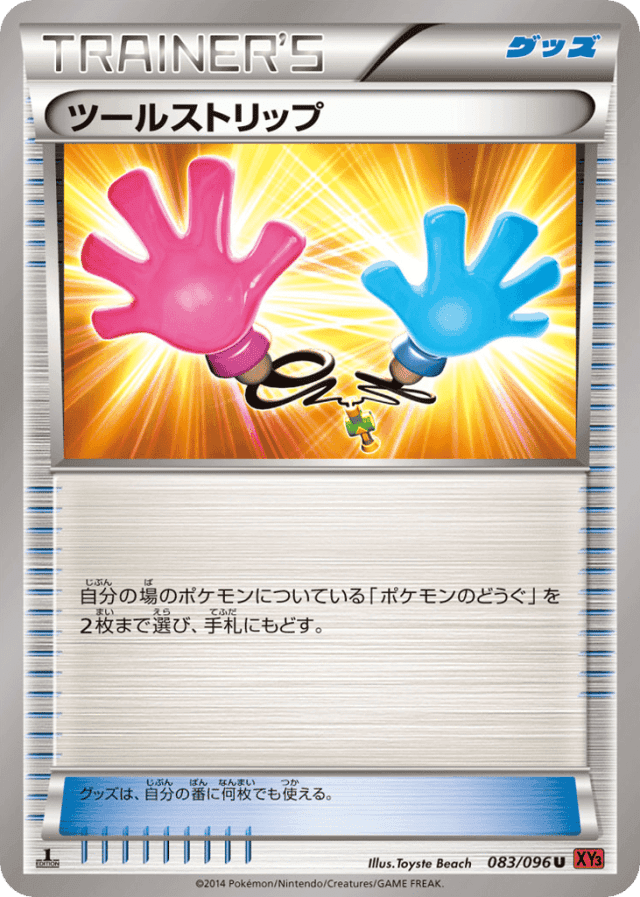 自分の場のポケモンについている「ポケモンのどうぐ」を2枚まで選び、手札にもどす。 グッズは、自分の番に何枚でも使える。
