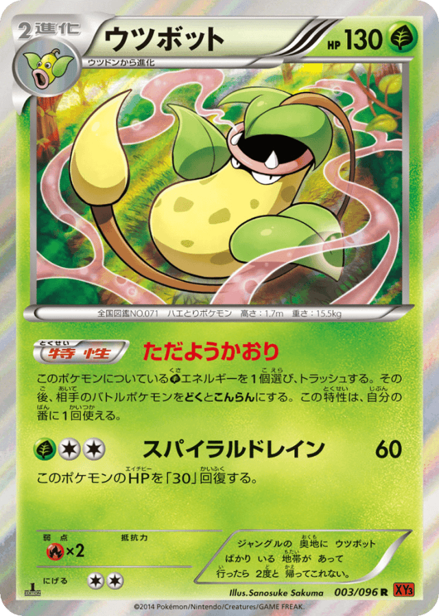 このポケモンについているGrassエネルギーを1個選び、トラッシュする。その後、相手のバトルポケモンをどくとこんらんにする。この特性は、自分の番に1回使える。